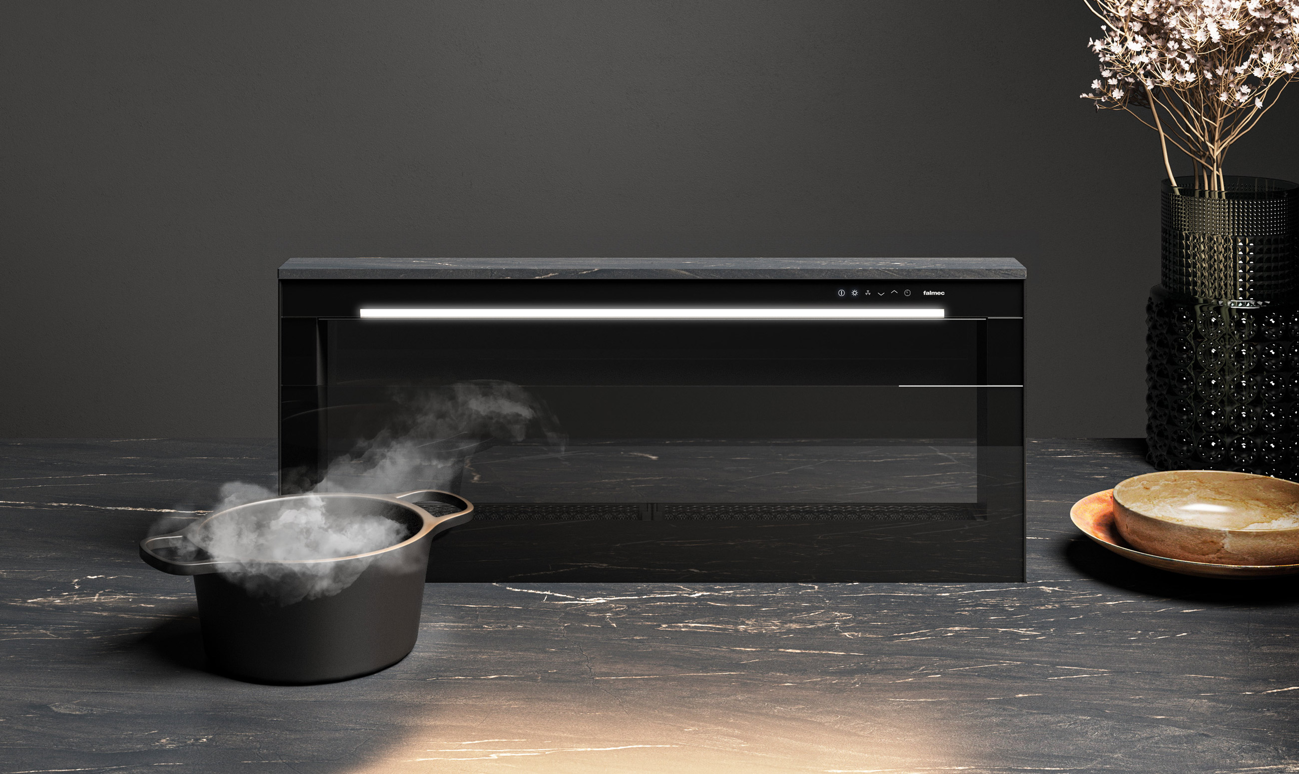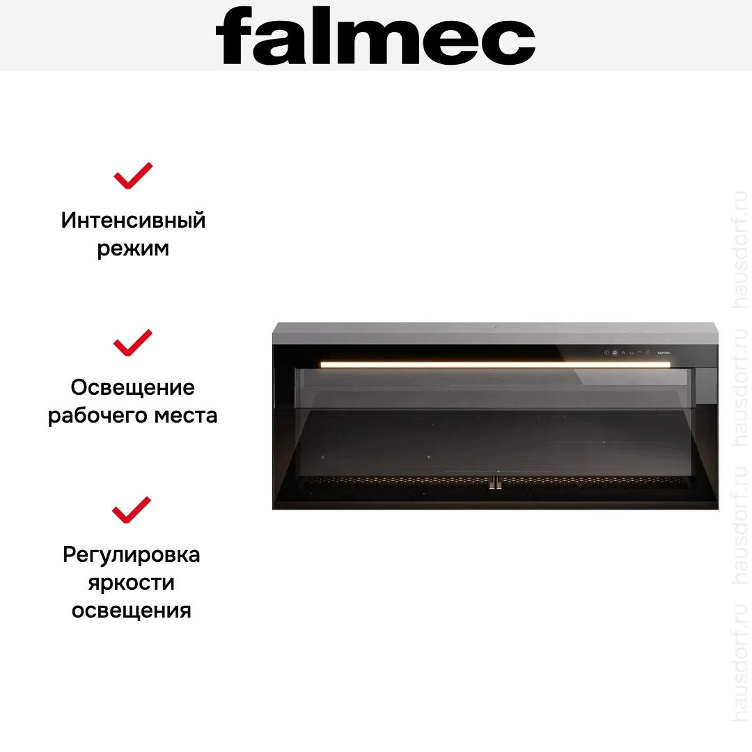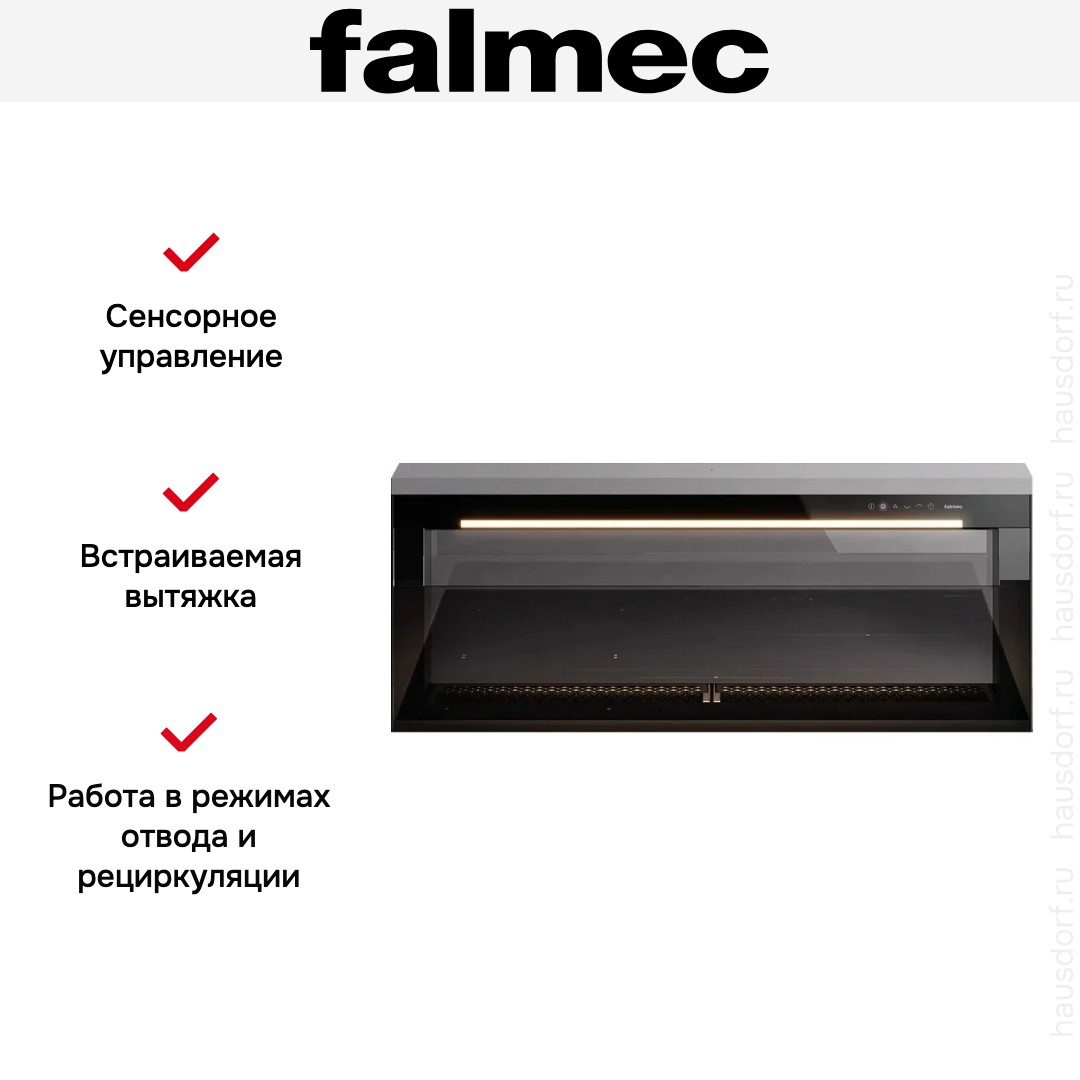 Встраиваемая вытяжка — выбор тех, кто хочет максимально задекорировать технику, или владельцев маленькой кухни. Тип встраивания: в стол. Обратите внимание на цветовые сочетания модели Falmec LEVEL INVISIBLE, чтобы органично вписать ее в свою квартиру. Оттенок корпуса: под навес вашего фасада. Благодаря лампочкам, которые расположены на нем, можно освещать плиту и столешницу рядом, чтобы готовить было еще проще и приятнее. Фишка этой техники — выдвижная панель.