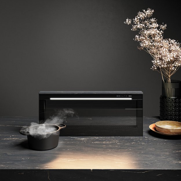 Вытяжки, встраиваемые в столешницу — эффективная инновация, которая подойдет для установки в кухне любой площади. Такие вытяжки размещаются за варочной поверхностью или рядом с ней. В отключенном состоянии всасывающая панель находится под столешницей, но после включения одной или нескольких конфорок она автоматически выдвигается при помощи специального лифтового механизма. Загрязненный воздух улавливается, не успевая распространиться по помещению. Когда вытяжка убрана, на виду остается только сенсорная панель управления. Недостатком подобных моделей является только сравнительно высокая цена.