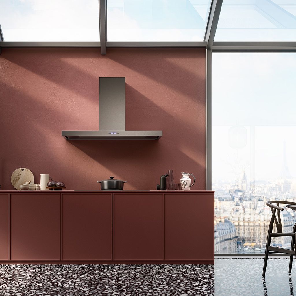 Т-образный дизайн распространен среди производителей премиальных и бюджетных вытяжек. Его легко реализовать, такая модель впишется в большинство кухонь и гарантировано покроет все рабочее пространство над варочной панелью. Часто выполняется из нержавеющей стали и используется в лофтах, также есть варианты с фронтальной панелью из стекла.