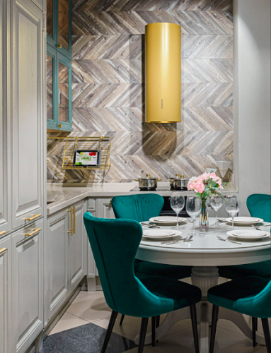 Вытяжки необычных цветов привносят в кухню оттенок индивидуальности.