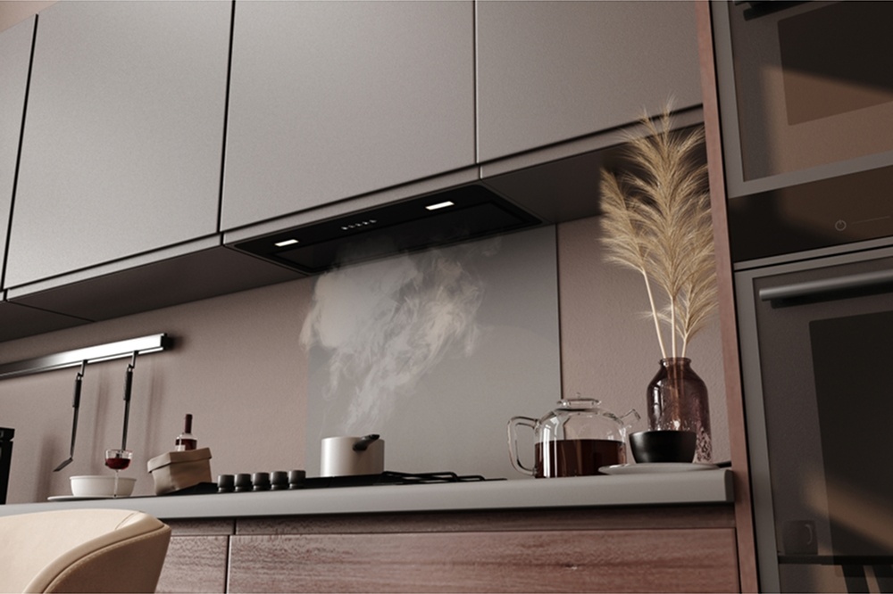 Вытяжки, встраиваемые в столешницу — эффективная инновация, которая подойдет для установки в кухне любой площади. Такие вытяжки размещаются за варочной поверхностью или рядом с ней. В отключенном состоянии всасывающая панель находится под столешницей, но после включения одной или нескольких конфорок она автоматически выдвигается при помощи специального лифтового механизма. Загрязненный воздух улавливается, не успевая распространиться по помещению. Когда вытяжка убрана, на виду остается только сенсорная панель управления. Недостатком подобных моделей является только сравнительно высокая цена.