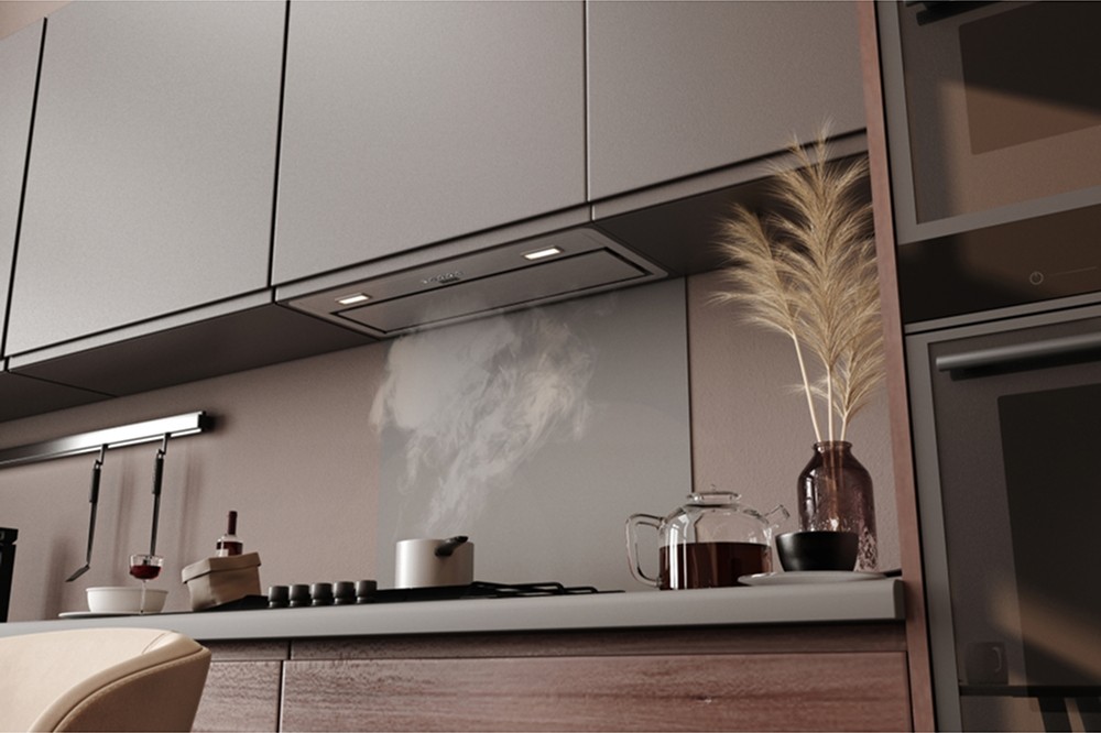 Вытяжка устанавливается в шкаф или в потолочную нишу — таким образом все соединительные элементы и корпус оказываются скрыты. Это подходящий вариант для небольшого помещения, если нужно максимально освободить пространство, а также необходимость, если вы продумываете кухонный дизайн до мелочей.