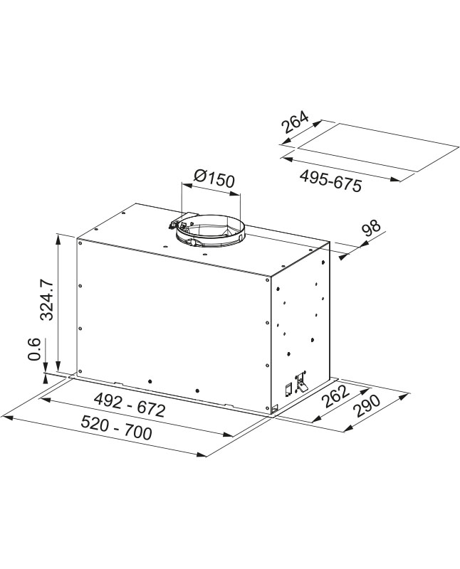 У многих встраиваемых моделей глубина может регулироваться, а рабочая всасывающая поверхность — увеличиваться благодаря выдвижному козырьку, но габариты корпуса такой вытяжки должны соответствовать размерам подвесного шкафа. Выбирать основные размеры вытяжки с соблюдением всех требований эффективности и безопасности работы следует также не в ущерб общему дизайну помещения.