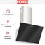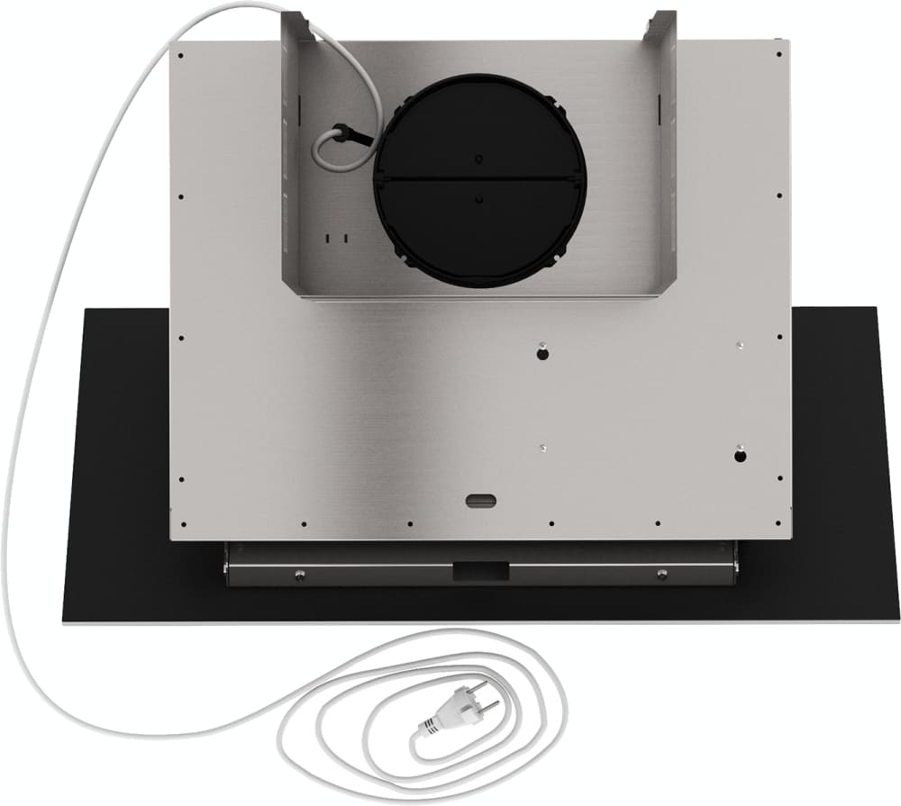 выглядит как сдержанная наклонная конструкция в черного цвета сочетании с элементами из нержавеющей стали, где стеклянный экран плавно продолжается в металл. Ширина корпуса 59 см и глубина 41,4 см делают профиль компактным, а высота 81,9 см (с возможностью увеличения до 120 см) позволяет регулировать размещение в зависимости от кухни. Двухцветное исполнение и тонкая форма формируют лаконичную визуальную линию, которая не доминирует в интерьере, но привлекает вниманием к деталям.