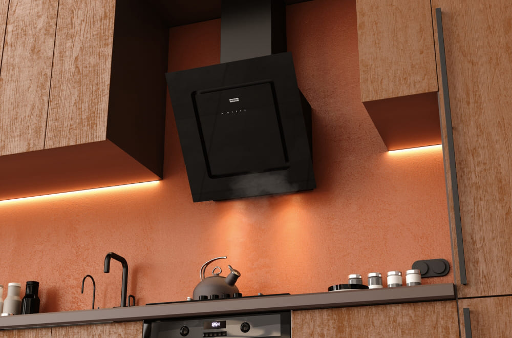 Наклонные модели — еще один вариант для небольшой кухни. Они размещаются на стене, но при высокой производительности не требуют много места. Их особенностью считается пониженный уровень шума и управление при помощи пульта ДУ. Эта категория вытяжек отличается большим разнообразием размеров, дизайна, цветов.