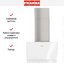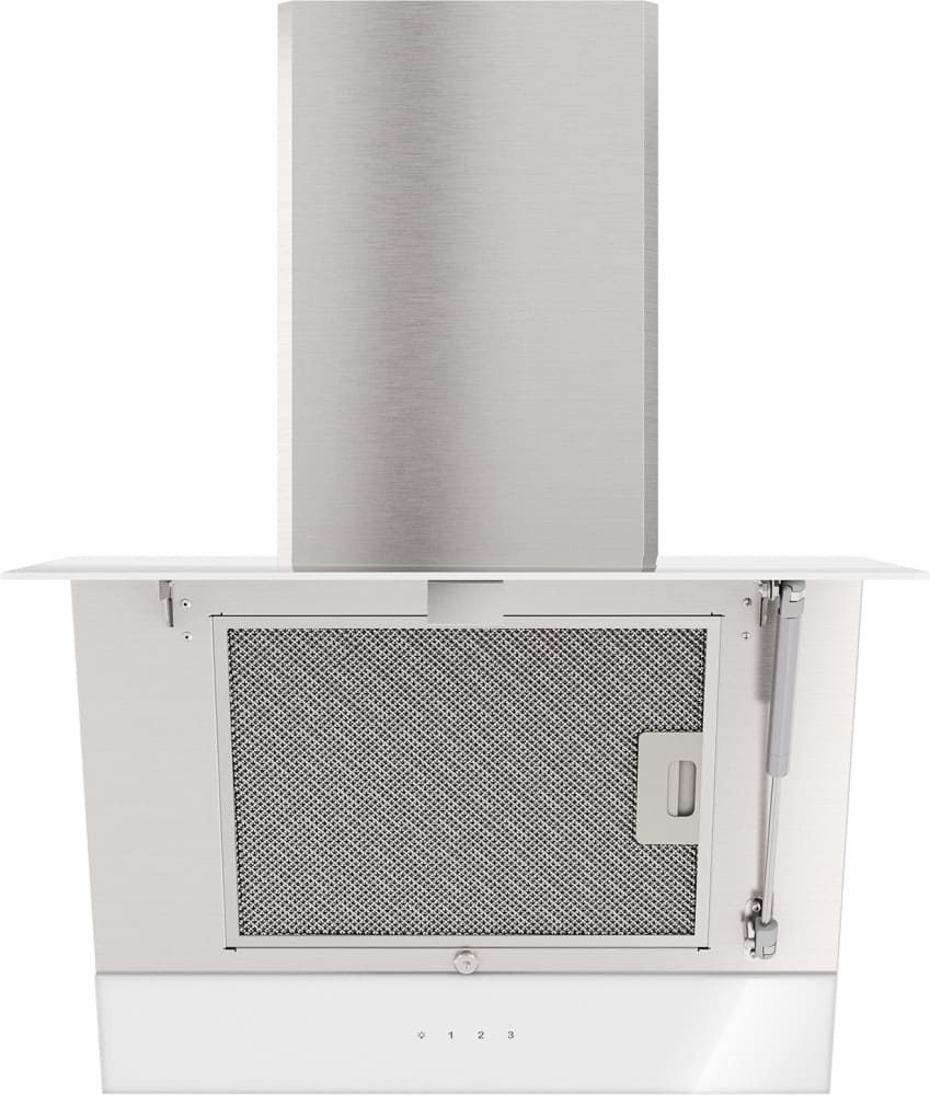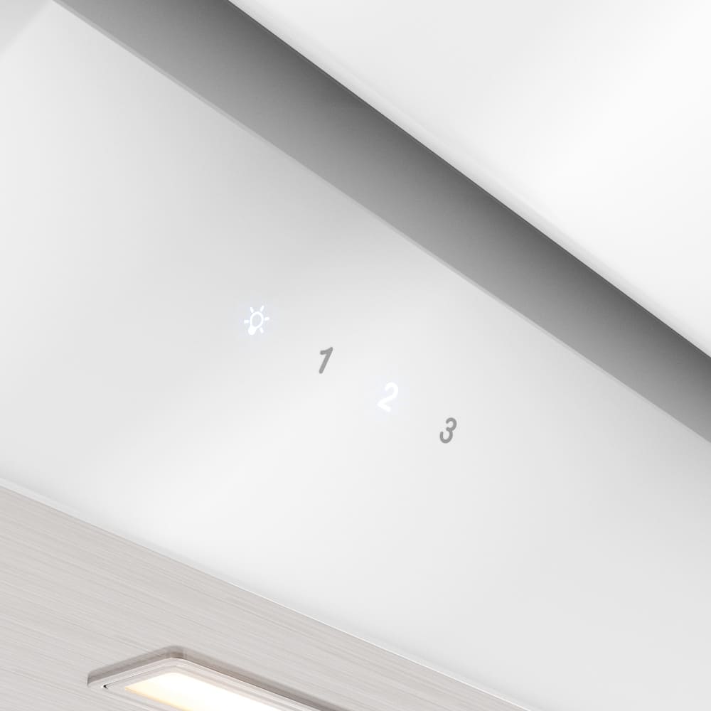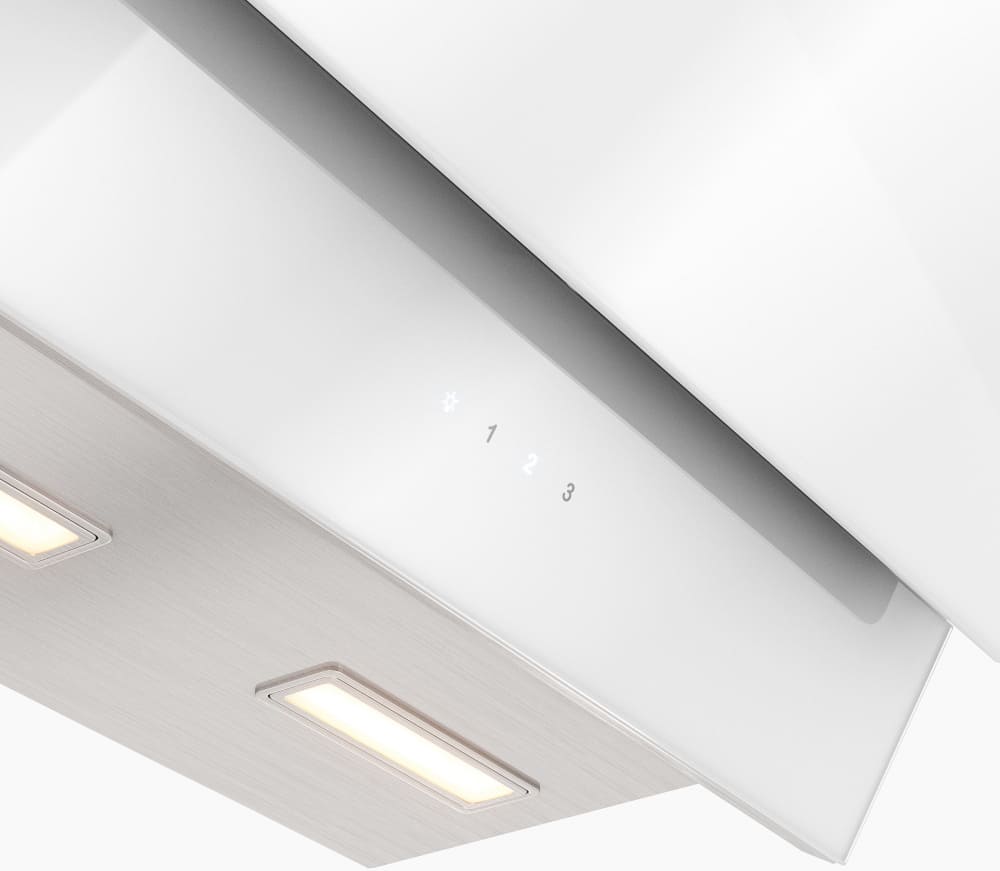 Выглядит как наклонная вытяжка белого цвета в сочетании нержавеющей стали и стекла: с плавной, чуть скошенной панелью и фронтальной сенсорной панелью управления. Ширина 59 см и глубина 43,2 см делают её компактной для типовой кухонной зоны, а высота регулируется от 73,2 до 120 см, что позволяет подстроить корпус по месту установки. Дизайн Maris подчёркивает строгие линии и светлую отделку — прибор привлекает внимание минималистичной формой без излишеств.