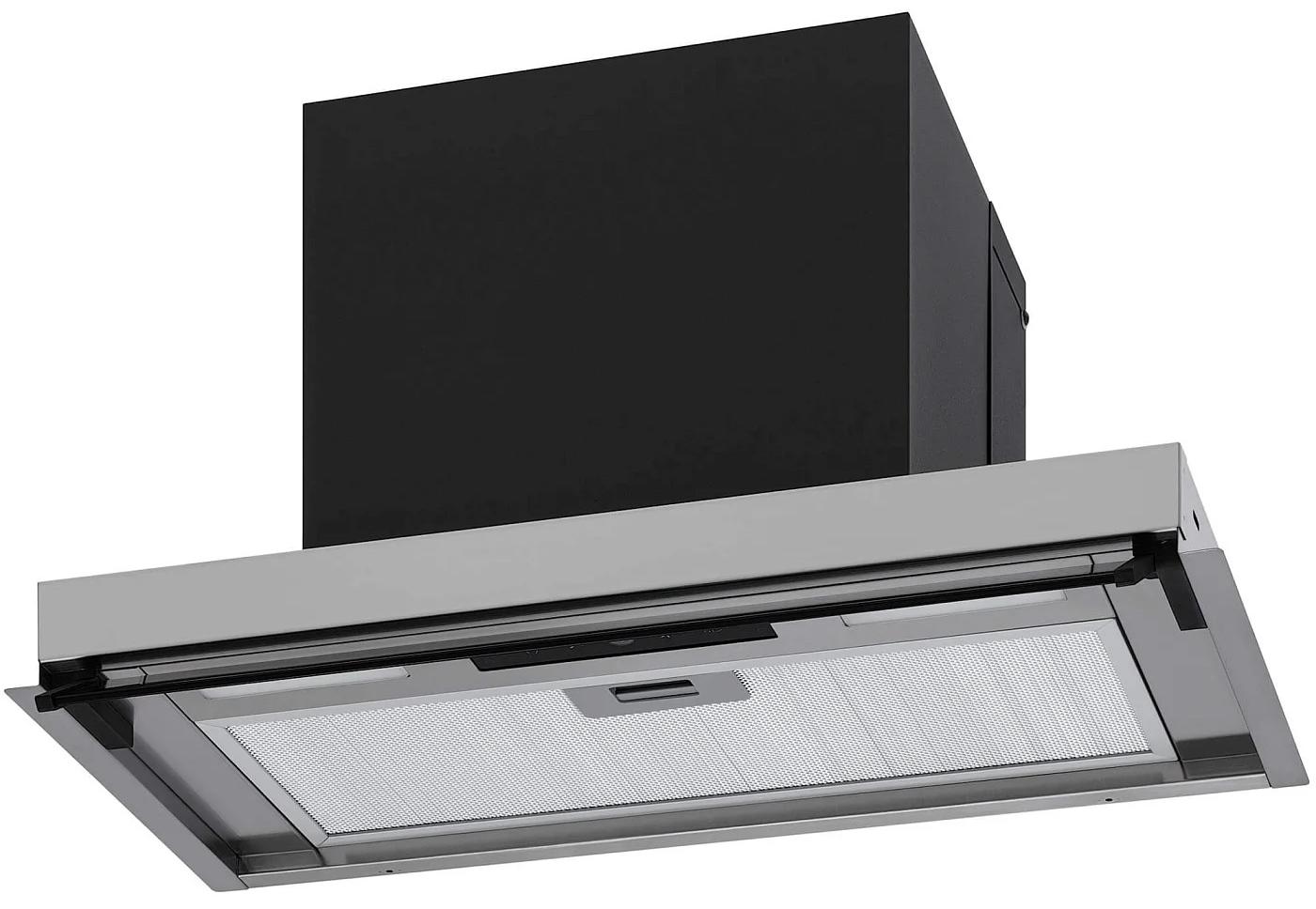 Вытяжки, встраиваемые в столешницу — эффективная инновация, которая подойдет для установки в кухне любой площади. Такие вытяжки размещаются за варочной поверхностью или рядом с ней. В отключенном состоянии всасывающая панель находится под столешницей, но после включения одной или нескольких конфорок она автоматически выдвигается при помощи специального лифтового механизма. Загрязненный воздух улавливается, не успевая распространиться по помещению. Когда вытяжка убрана, на виду остается только сенсорная панель управления. Недостатком подобных моделей является только сравнительно высокая цена.