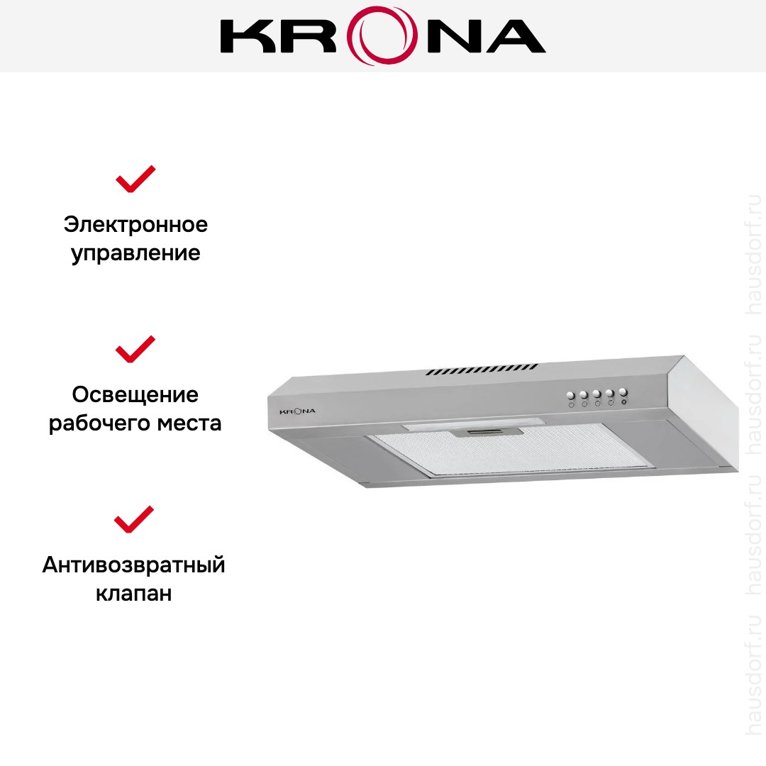 Встраиваемая вытяжка — выбор тех, кто хочет максимально задекорировать технику, или владельцев маленькой кухни. Тип встраивания: в шкаф. Обратите внимание на цветовые сочетания модели KRONA JILLIAN 500 inox PB, чтобы органично вписать ее в свою квартиру. Оттенок корпуса: нержавеющая сталь. Благодаря лампочкам, которые расположены на нем, можно освещать плиту и столешницу рядом, чтобы готовить было еще проще и приятнее.