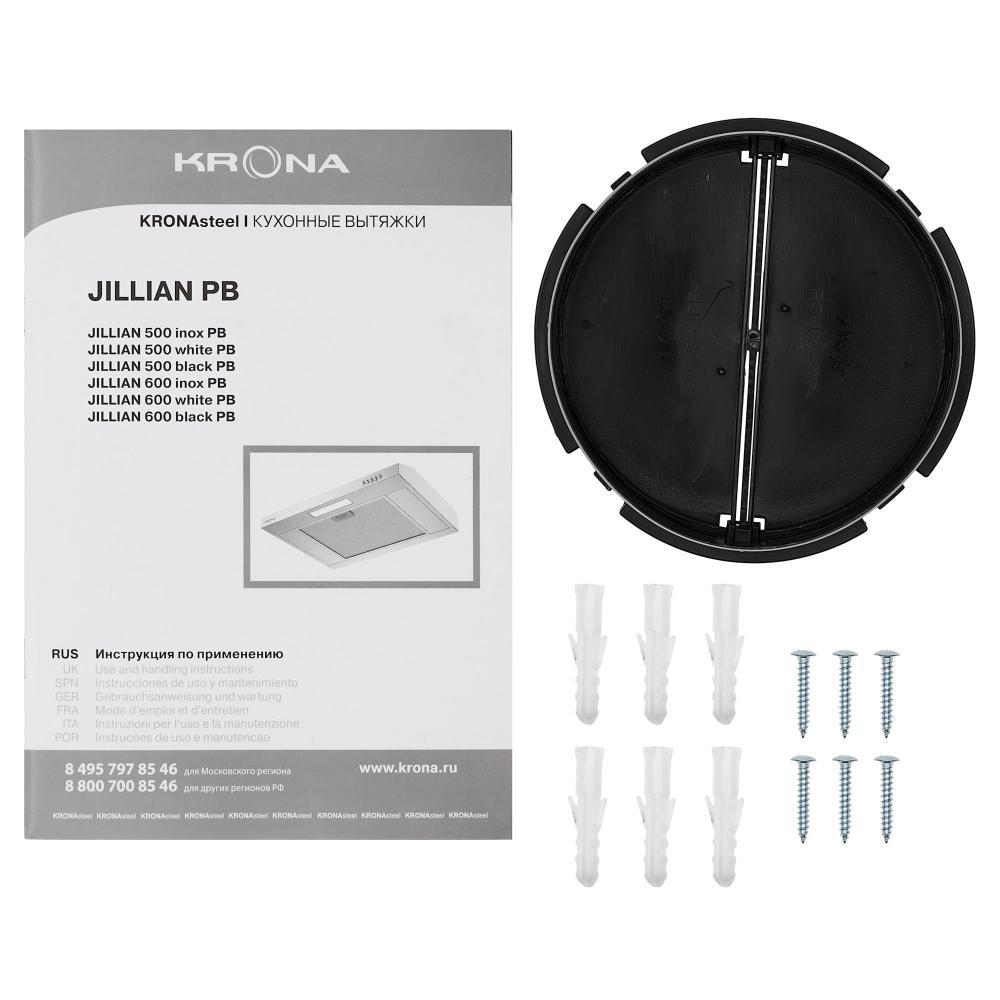 Встраиваемая вытяжка — выбор тех, кто хочет максимально задекорировать технику, или владельцев маленькой кухни. Тип встраивания: в шкаф. Обратите внимание на цветовые сочетания модели KRONA JILLIAN 500 white PB, чтобы органично вписать ее в свою квартиру. Оттенок корпуса: белый. Благодаря лампочкам, которые расположены на нем, можно освещать плиту и столешницу рядом, чтобы готовить было еще проще и приятнее.
