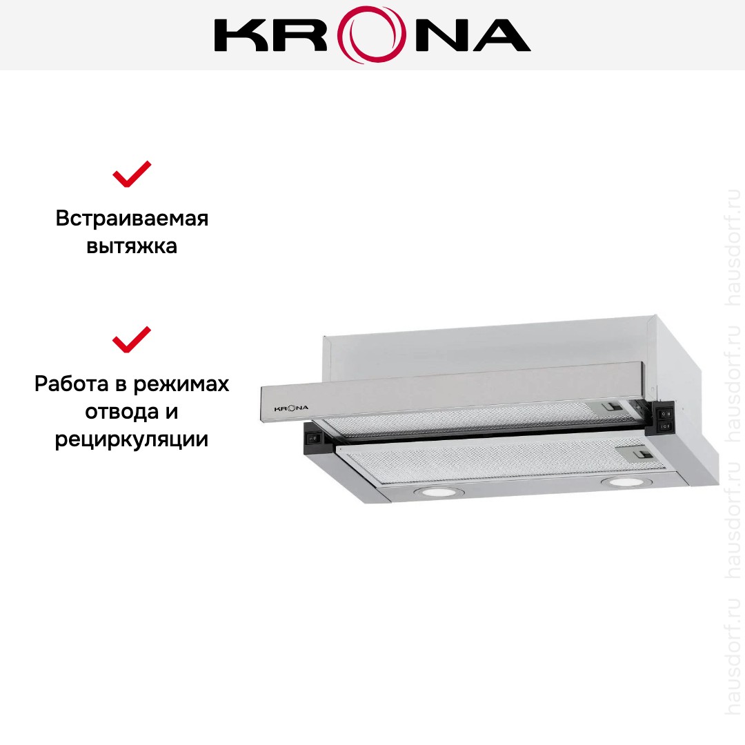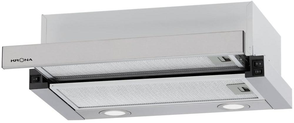 Встраиваемая вытяжка — выбор тех, кто хочет максимально задекорировать технику, или владельцев маленькой кухни. Тип встраивания: в шкаф. Обратите внимание на цветовые сочетания модели KRONA KAMILLA MV 500 IX, чтобы органично вписать ее в свою квартиру. Оттенок корпуса: нержавеющая сталь. Благодаря лампочкам, которые расположены на нем, можно освещать плиту и столешницу рядом, чтобы готовить было еще проще и приятнее. Фишка этой техники — выдвижная панель.