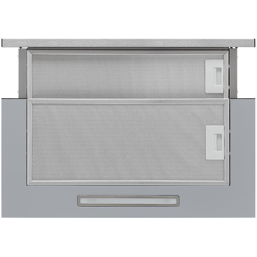 Можно выделить два основных вида вытяжек с выдвижной панелью. В вытяжках, встраиваемых в подвесной шкаф, выдвижная панель необходима, так как размеры таких устройств определяются размерами самого шкафа. В закрытом состоянии глубина вытяжки может быть меньше глубины варочной поверхности. Телескопическая выдвижная панель, которая устанавливается преимущественно в устройствах, работающих в режиме отвода, гарантирует полный захват воздуха, загрязненного каплями жира, частицами сажи, испарениями. Панель можно выдвинуть как нажатием на кнопку, так и потянув за ее переднюю часть. В некоторых моделях при подобном выдвижении одновременно включается подсветка. Когда же панель убрана, вытяжка становится практически незаметной — такой вариант лучше всего подходит для небольшой кухни.