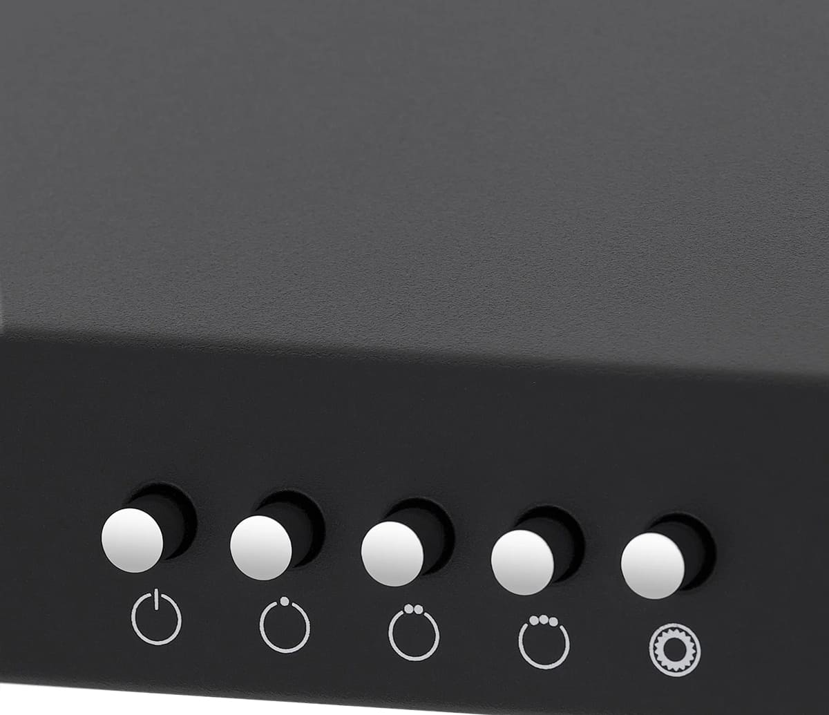 Встраиваемые и простые настенные модели, как правило, оснащаются боковой панелью управления, состоящей из нескольких кнопок. Их количество зависит от числа скоростей, наличия интенсивного режима и встроенного освещения. Боковое расположение панели управления делает вытяжку еще более незаметной.