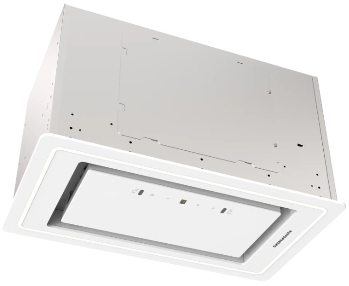 Вытяжка, встраиваемая в потолок, часто устанавливается над кухонным островом в просторной кухне и отличается достаточно высокой мощностью: она может работать как в режиме рециркуляции, так и в режиме отвода, так как воздуховод также скрыт в потолке. Вытяжки могут монтироваться в подвесной потолок либо устанавливаться в специальные многоярусные конструкции из гипсокартона непосредственно во время ремонта кухни. Для управления ими используется пульт ДУ.