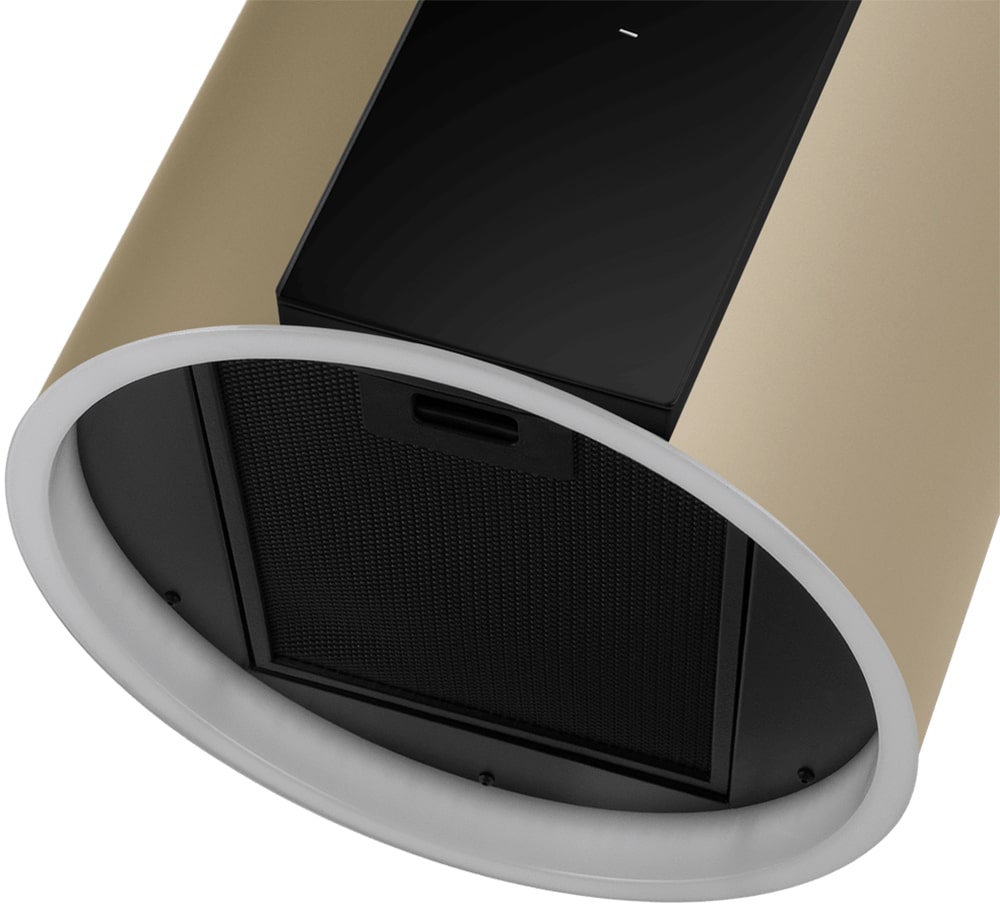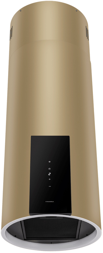 Вытяжка Maunfeld Alba 39 Isla Gold — прибор островного типа в золотом исполнении, который объединяет выразительный дизайн и практичные инженерные решения. Цилиндрический силуэт из металла с тёплым оттенком выглядит эффектно и придает центру кухни статусный вид. Компактные габариты 110×38×39.5 см позволяют разместить технику над островной варочной панелью без ощущения громоздкости.