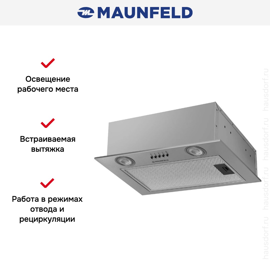 Встраиваемая Maunfeld BAY 45 PUSH INOX — компактная вытяжка, предназначенная для установки в шкаф. Она изготовлена из нержавеющей стали и рассчитана на аккуратную интеграцию в кухонный гарнитур. Металлический корпус обеспечивает долгий срок службы и устойчивость к механическим воздействиям, нержавеющая сталь не боится влажного воздуха и легко очищается от следов жира.