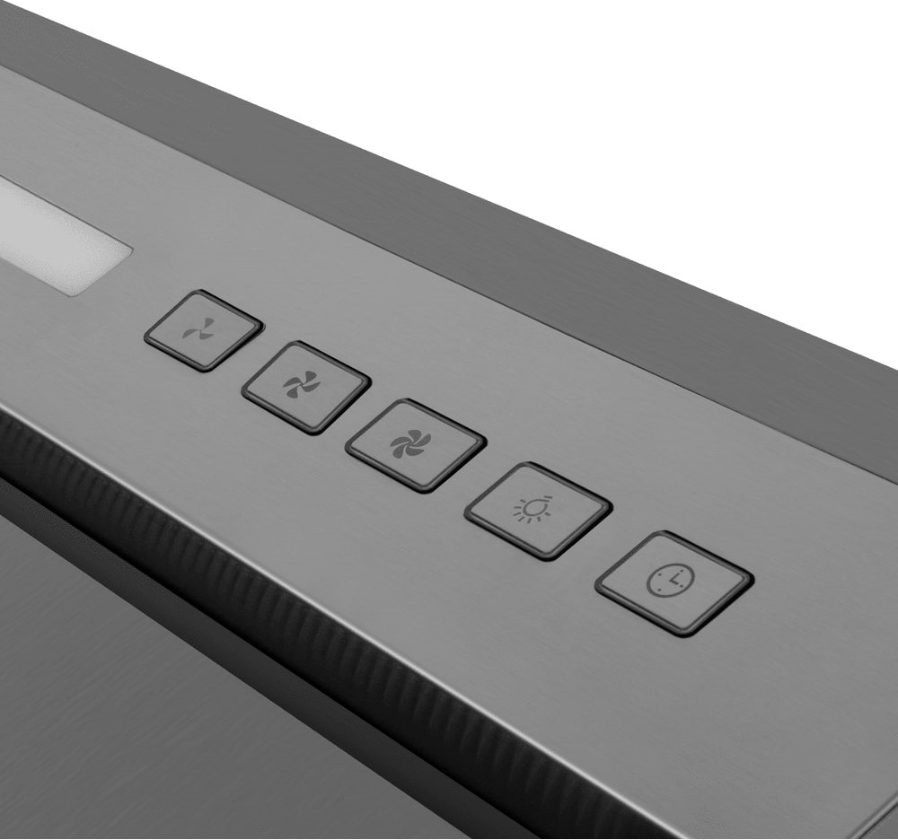 Наиболее распространенным элементом управления являются кнопки — ими оснащаются устройства с механическим управлением. Кнопки можно увидеть у вытяжек всех типов, от простых встраиваемых до дизайнерских подвесных, островных или наклонных. Количество кнопок зависит от набора функций: в простейшем случае достаточно всего трех кнопок — двух для переключения скоростей и одной для включения освещения. Как правило, они имеют круглую форму, однако производители предлагают устройства с квадратными и даже треугольными кнопками. В больших купольных вытяжках кнопки могут изготавливаться из меди, бронзы или латуни, а моделях современного дизайна — оснащаться подсветкой.