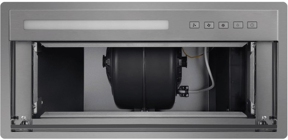 Вытяжка устанавливается в шкаф или в потолочную нишу — таким образом все соединительные элементы и корпус оказываются скрыты. Это подходящий вариант для небольшого помещения, если нужно максимально освободить пространство, а также необходимость, если вы продумываете кухонный дизайн до мелочей.