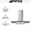 Вытяжка Smeg сделана из нержавеющей стали, перпендикулярно воздуховоду установлен широкий стеклянный экран, который покрывает даже нестандартную варочную панель. Данную модель необходимо разместить на стене на определенном расстоянии от рабочей поверхности (обратите внимание — все параметры перечислены в инструкции).