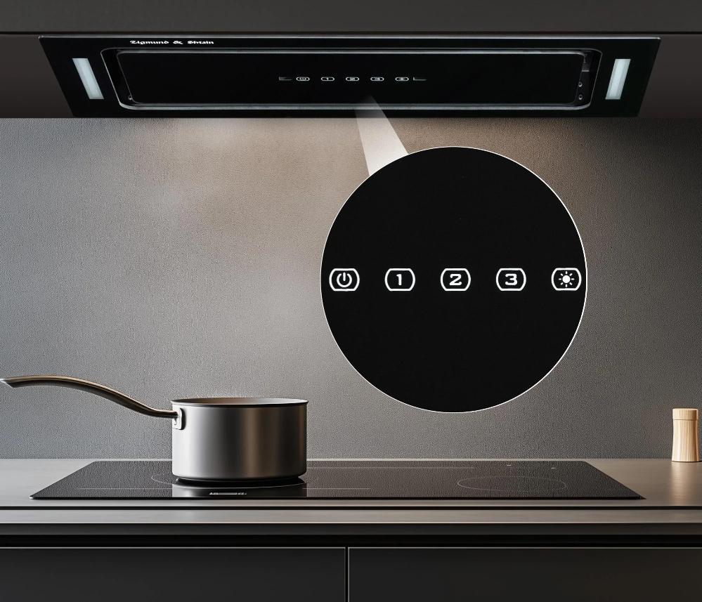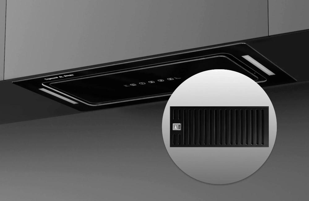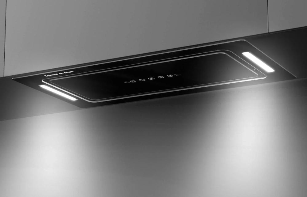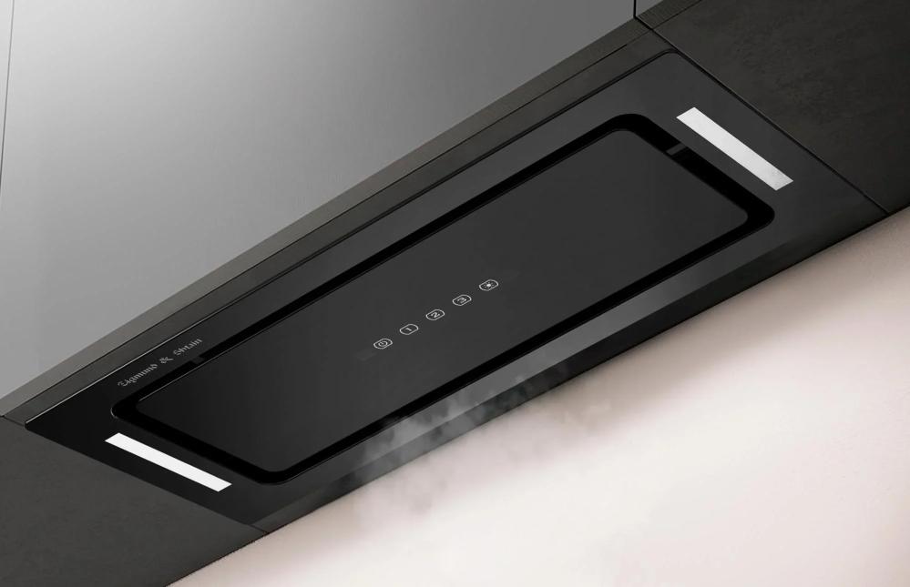 Вытяжки, встраиваемые в столешницу — эффективная инновация, которая подойдет для установки в кухне любой площади. Такие вытяжки размещаются за варочной поверхностью или рядом с ней. В отключенном состоянии всасывающая панель находится под столешницей, но после включения одной или нескольких конфорок она автоматически выдвигается при помощи специального лифтового механизма. Загрязненный воздух улавливается, не успевая распространиться по помещению. Когда вытяжка убрана, на виду остается только сенсорная панель управления. Недостатком подобных моделей является только сравнительно высокая цена.