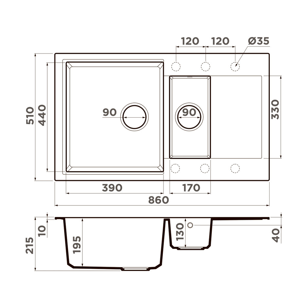Omoikiri Daisen-86-2 BL - схема с размерами к мойке на разных языках на Hausdorf