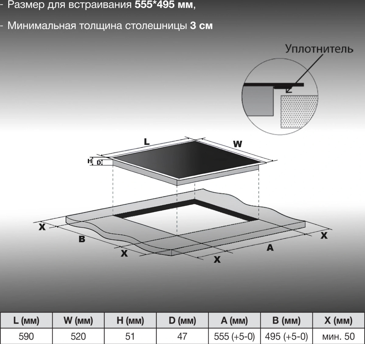Hyundai HHE 6452 WG - схема встраивания к варочной панели на разных языках на Hausdorf