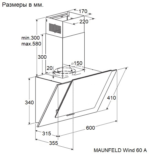 Maunfeld Wind 60 A White - схема с размерами версия 2 к вытяжке на разных языках на Hausdorf